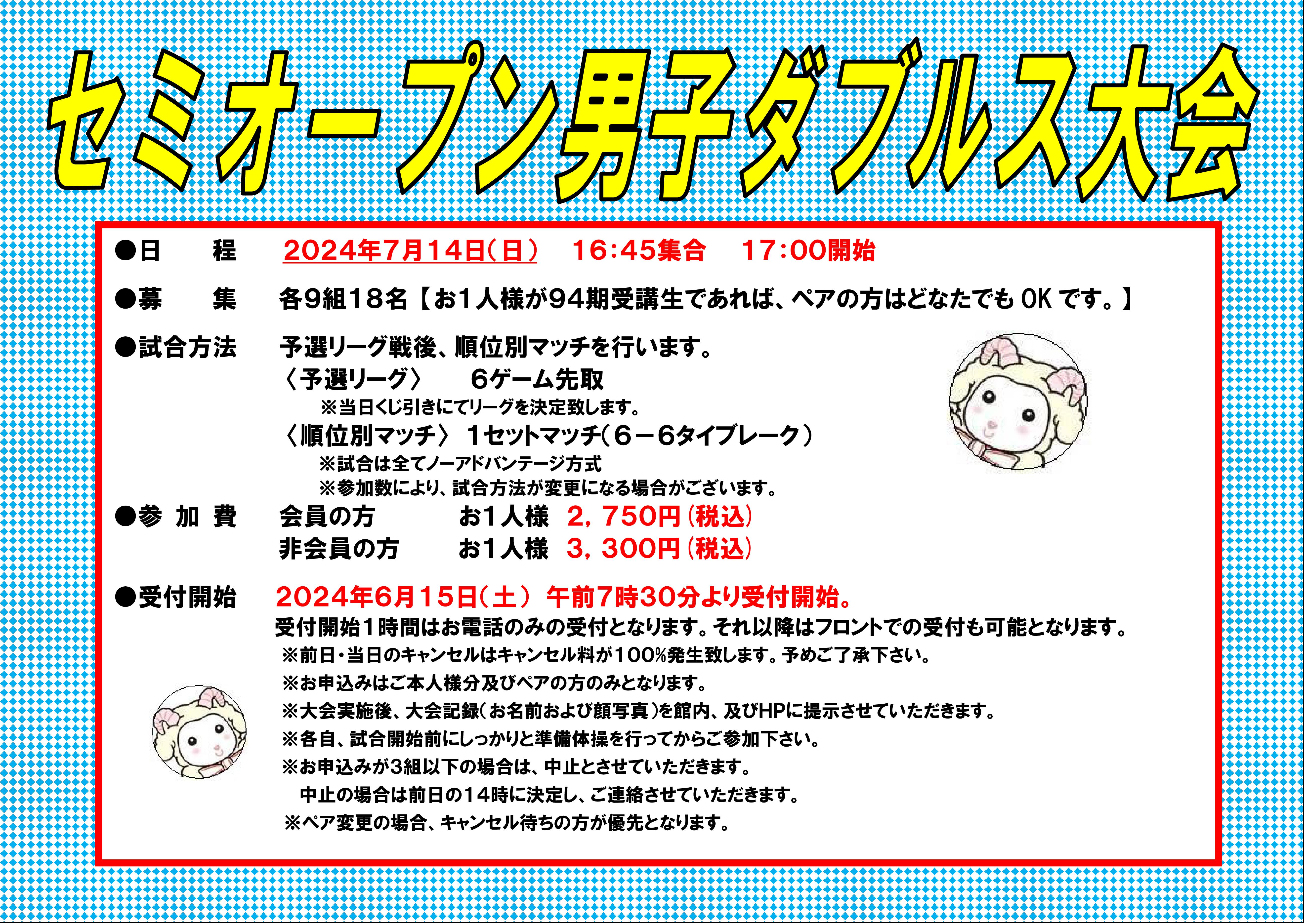 第93期 7/14(日) セミオープン男子ダブルス大会